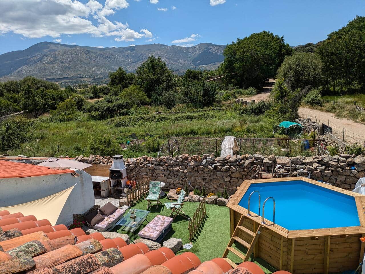 El jardín trasero cuenta con una mesa para comer con 6 sillas en un porche cubierto con barbacoa y un pequeño chillout rural donde poder tomarse un refresco de manera sosegada. el jardin también cuenta con 2 tumbonas relax para tomar el sol y sobretodo lo mejor son las vistas espectaculares y despejadas de la sierra donde se puede divisar la SERROTA y el monasterio del RISCO una ruta de senderismo singular de la zona que nos lleva hasta un antiguo monasterio (SXVI) de monjes que también funcionó como hospedería para peregrinos y en la que se conserva la torre del campanario desde donde se obtienen unas vistas inmejorables de la zona.